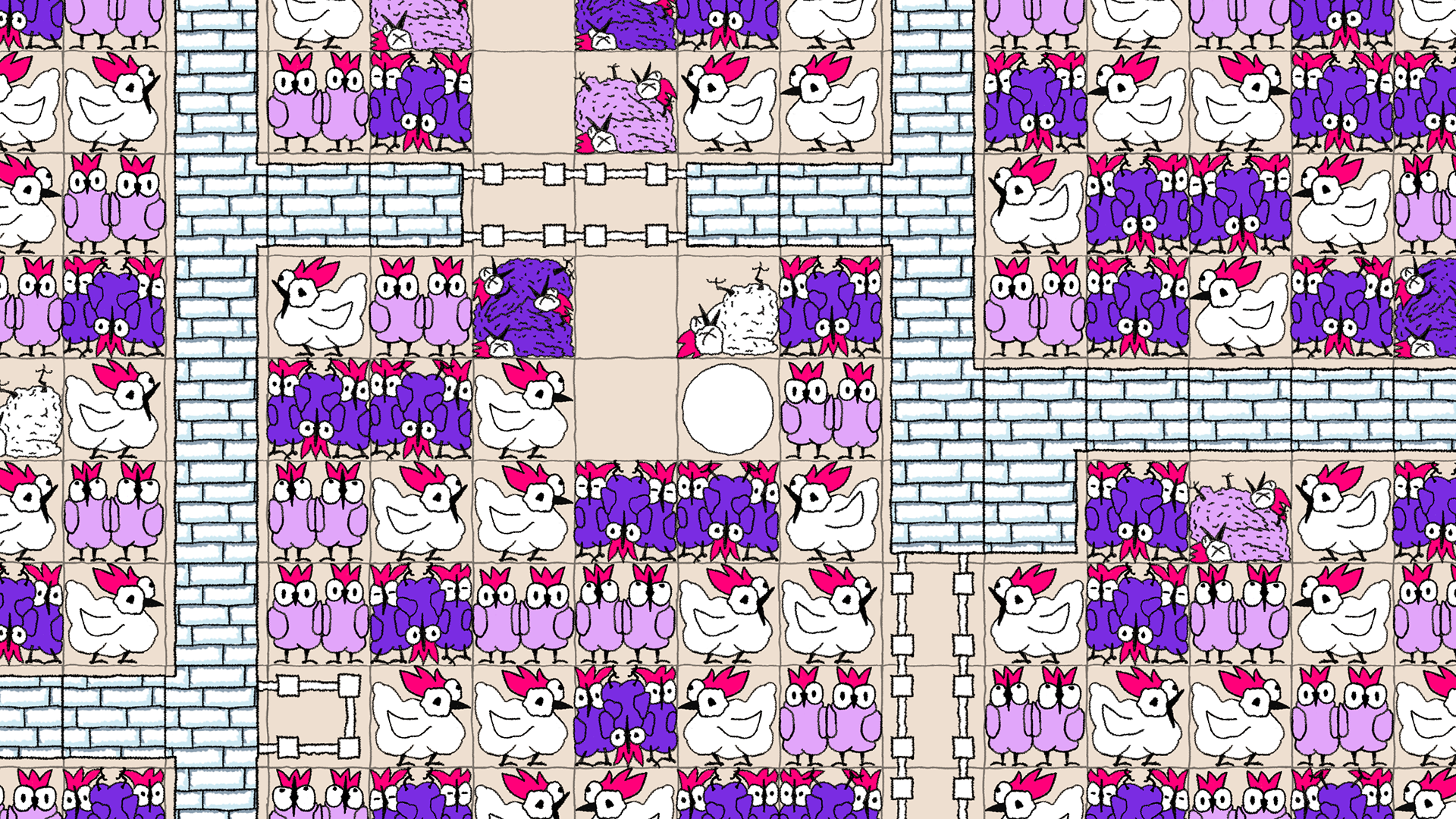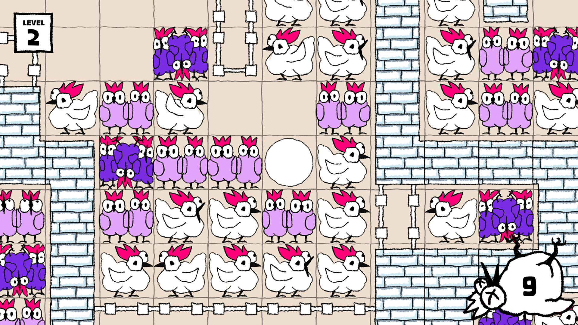 The chickens stack up to three per field, whether alive or dead. If the space is too tight, the chickens die instantly. Fight your way through multiple levels as the pens grow larger and the number of chickens increases.